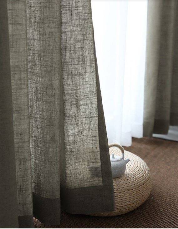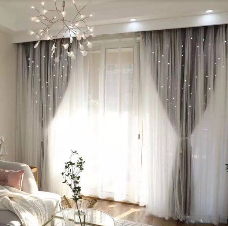 هذا تصميم حديث باللونين الرمادي والأبيض وهو خفيف في النسيج، يتم وضع ستارتين إضافيتين فوق القضيب. وبينهما ستارة بيضاء سادة (يمكنك الاستغناء عنها) مصحوبة بستارة رمادية بسيطة على كلا الجانبين أو الألوان المناسبة للأثاث.
